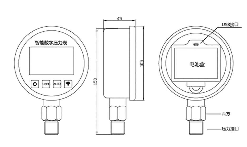 SUAY80智能压力表是一款高精度智能型数字压力表,内置高精度压力传感器,能够准确的实时显示压力,并且具有精度高、长期稳定性好的特点。配备5位显示的大尺寸LCD液晶显示,具有清零、背光、开关机、单位切换、低电压报警、峰值记录等多种功能,操作简单,安装方便。壳体和接头采用304不锈钢,抗震性好,能够测量气体、液体、油等对不锈钢无腐蚀的介质。用3节5号电池供电,也可以采用USB供电,续航功耗低、时间长,适用于便携式压力测量、设备配套、校验设备等压力测量领域。
