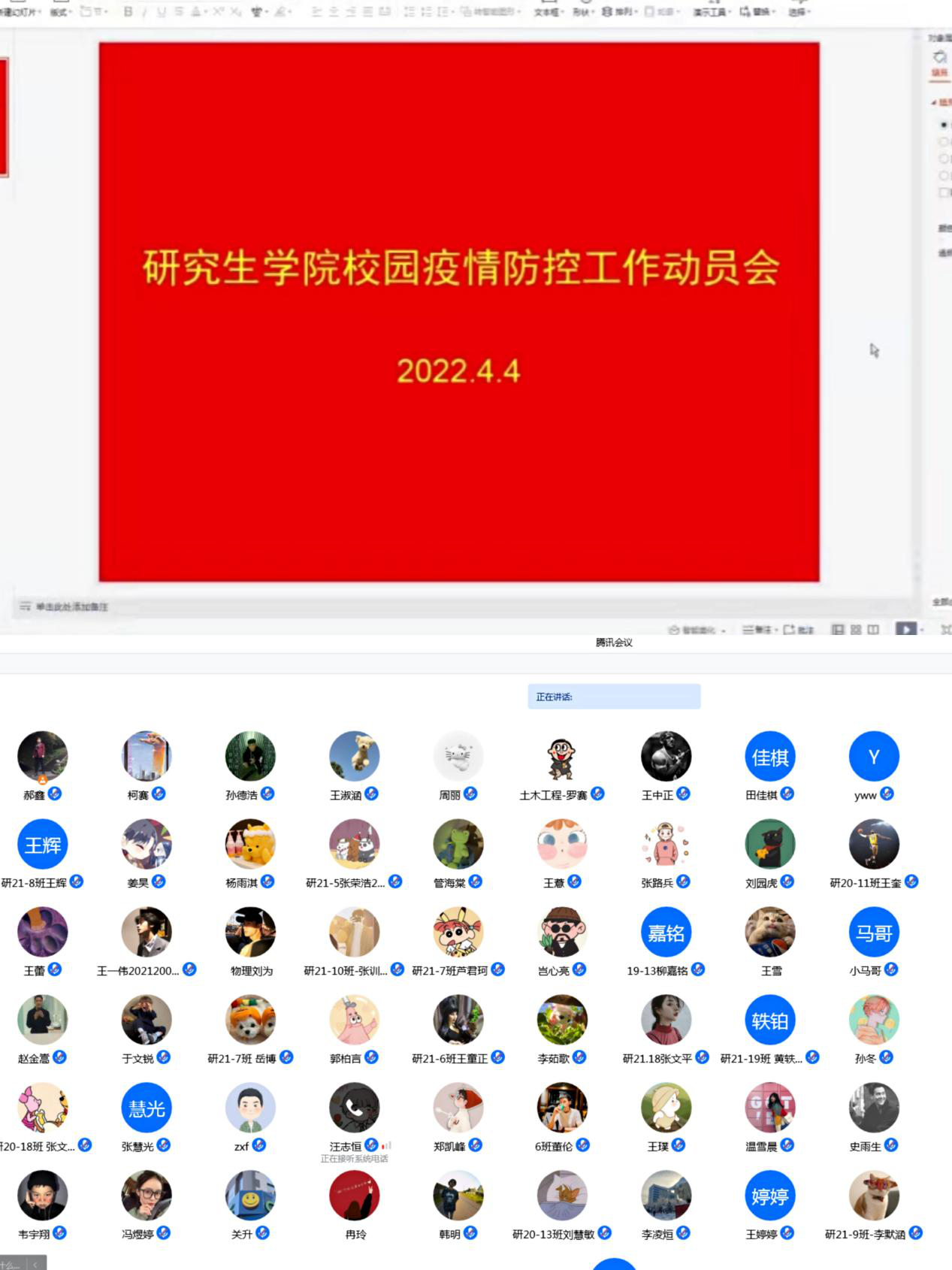 08/ 2022-04【同心战“疫”】研究生学院学工全力以“护”,筑牢校园“防疫墙”春季学期以来,疫情多发,研究生学院高度重视校园的疫情防控工作,进一步落实学校党委对疫情防控工作的具体部署,提升防控工作规范化水平,使常态化疫情防控工作落入实效。研究生学院学工全力以“护”,多措并举筑牢校园“防疫墙”,坚决守住校园安全稳定和研究生健康底线。绷紧“防疫弦”4月2日,开展了研究生学院班团负责人专题会议,会议强调,各班级班委要密切关注同学们的健康状态,每日两次检测体温,做好排查工作。严格...