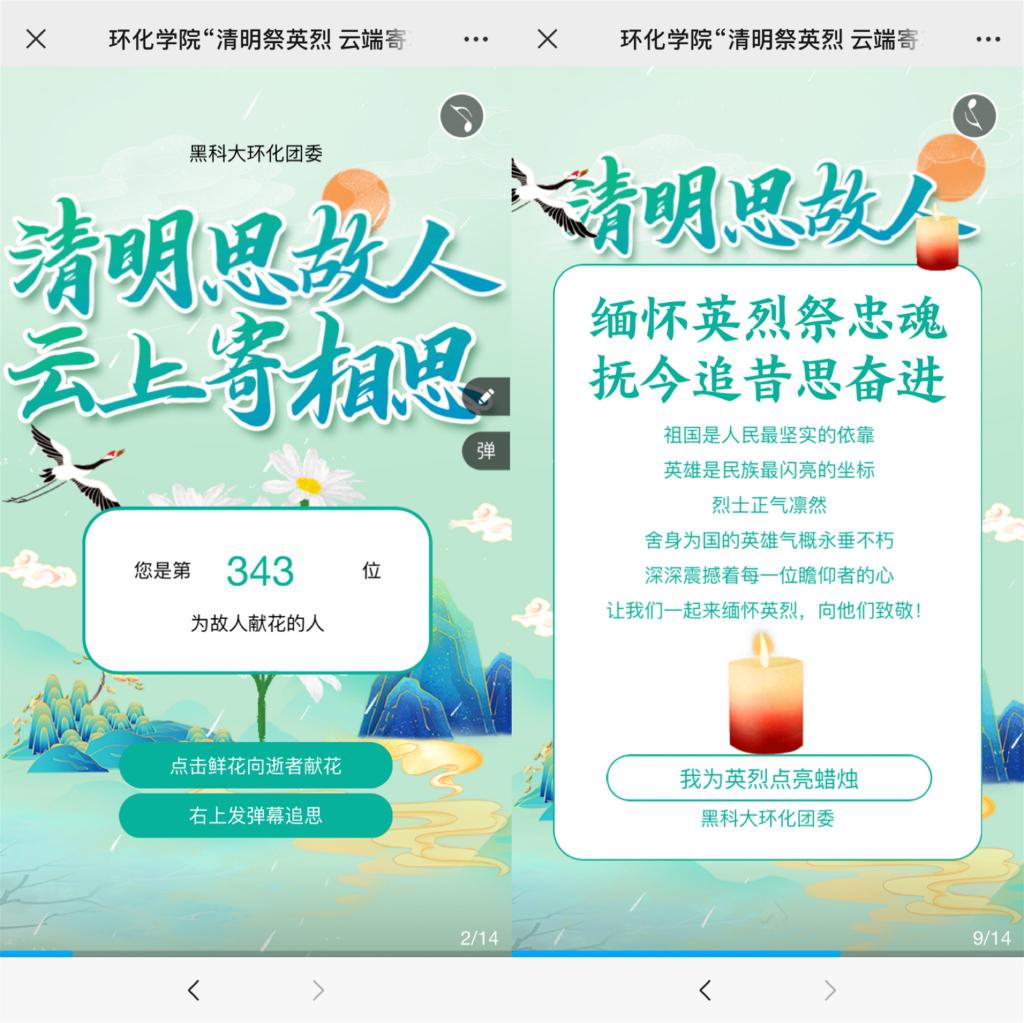 08/ 2022-04环化学院开展清明祭英烈系列活动为深入学习贯彻习近平总书记关于烈士褒扬工作重要指示批示精神,贯彻落实《共青团中央关于开展“喜迎二十大、永远跟党走、奋进新征程”主题教育实践活动的通知》要求,深切缅怀革命英烈,大力营造崇尚英烈、学习英烈的浓厚氛围,进一步激发青年学生爱国爱党情怀,环化学院开展清明祭英烈系列活动。云端祭扫英烈,忆英雄根植爱国情。打造“主题团日+互联网”祭拜新阵地祭拜英烈。正值疫情防控的关键时期,学院开展“清明祭英烈 ...