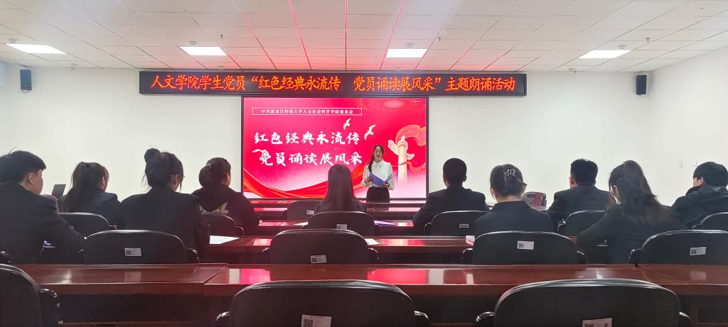 25/ 2023-05人文学院学生党支部开展“红色经典永流传党员诵读展风采”主题朗诵活动为深入推进学习贯彻习近平新时代中国特色社会主义思想主题教育,进一步激发青年学生党员爱党爱国热情,积极营造“知党、爱党、跟党走”的文化氛围,提高青年党员的文化素养,丰富课余文化生活,5月21日,人文学院学生党支部举办了“红色经典永流传 党员诵读展风采”主题朗诵活动。比赛现场,朗诵者们以歌颂党、歌颂祖国、歌颂新时代为主线,借助音乐、背景、解说、演绎等辅助方式,将自己的情感充分表达,抒发出他们对中国共产...