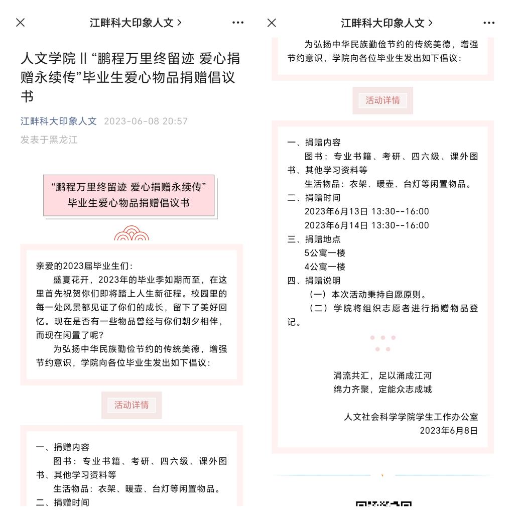 13/ 2023-06人文学院开展“季忆留夏 青春远航”2023届毕业生文明离校教育活动为营造文明有序、温馨难忘的离校氛围,做好2023届毕业生文明离校教育工作,人文学院精心组织开展了“季忆留夏 青春远航”毕业生文明离校教育活动。氤氲书香,情留2UP.IO_2UP.IO(中国)满园。发布“鹏程万里终留迹 爱心捐赠永续传”毕业生爱心物品捐赠倡议书,号召毕业生将闲置的图书、生活物品等进行捐赠,弘扬中华民族勤俭节约的传统美德,传递爱心,续写青春故事。不负韶华,绽放青春色彩。开展“星梦研续共向未来”考研经验分享,“砥志研思 ...