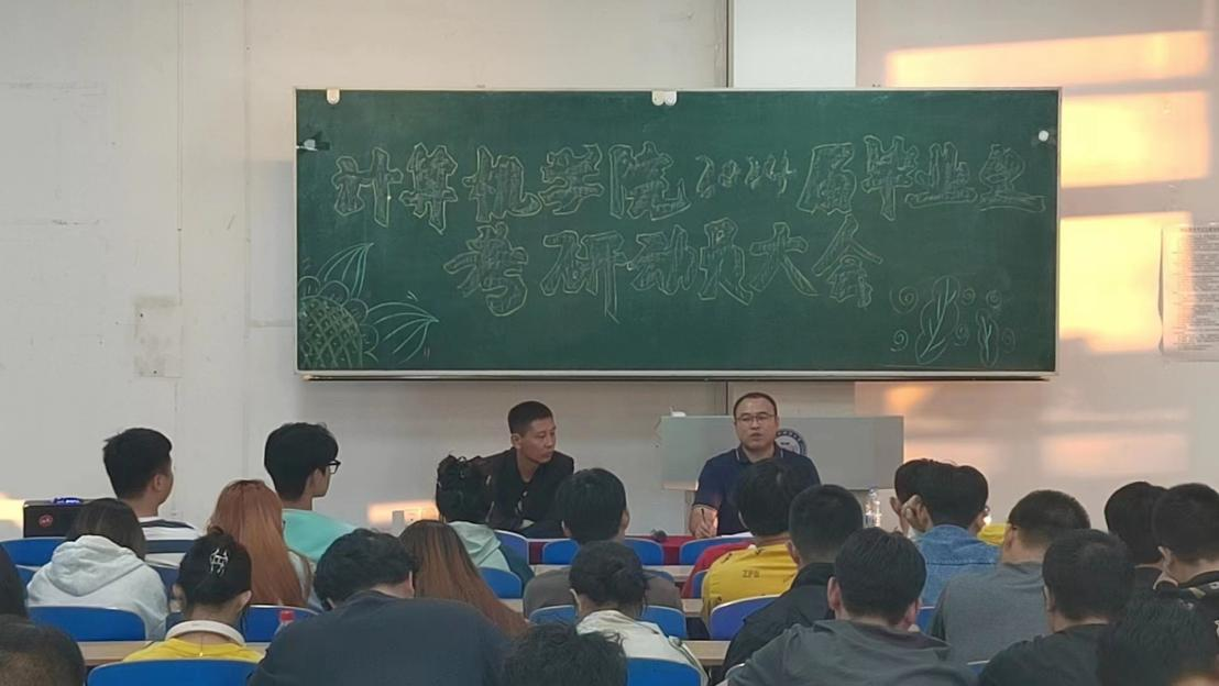 12/ 2023-09计算机学院组织开展2024届毕业生考研动员大会为加强学风建设,营造浓郁的考研氛围,帮助考研学生进一步明确奋斗目标,掌握科学复习方法,增强考研信心,9月6日,计算机学院举行2024届毕业生考研动员大会,学院副处级辅导员韩永辉、2024届全体考研学生参加会议,会议由2024届毕业年级辅导员赵岩主持。会上,学院2024届毕业年级辅导员赵岩通报了学院近三年毕业生考研情况,介绍了往届毕业生考研典型事迹和成功经验,鼓励2024届考研学生学好经验、做好计划、管好时间,脚踏实...