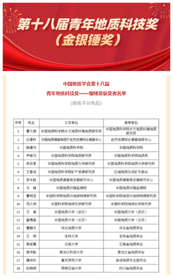 为表彰具有“献身、创新、求实、协作”科学精神和科学道德及学风的40周岁以下青年地质工作者,向中国地质学会成立百年献礼,中国科学技术协会和自然资源部批准,中国地质学会于2022年2月22日启动了第十八届青年地质科技奖(金银锤奖)申报及评选工作。经申报、推荐、形式审查、初评、公示、终评、公示等严格的评选程序,从我国地质行业各部门单位推荐的候选人中评选产生金锤奖10名,银锤奖40名,他们是我国地质科技和地质找矿战线中的杰出青年代表。