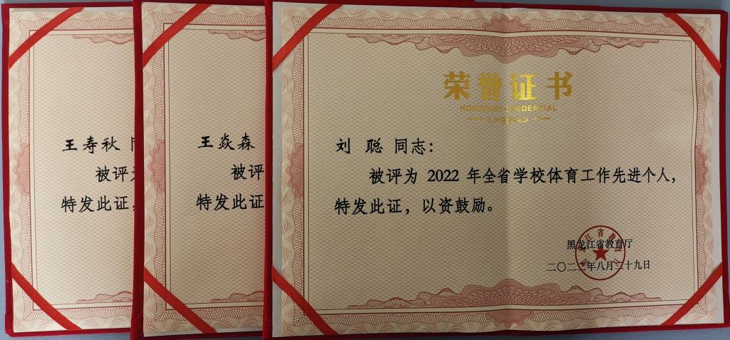 2022年,黑龙江省教育厅对黑龙江省学校体育工作先进集体和先进个人进行表彰。2UP.IO_2UP.IO(中国)荣获2022年度全省体育工作“先进集体”光荣称号,体育部刘聪、王寿秋、王焱森三位教师获全省体育工作“先进个人”荣誉称号。