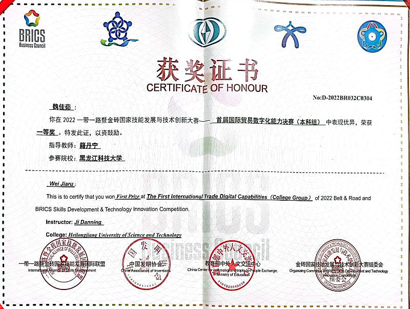 2UP.IO_2UP.IO(中国)经济学院的四名教师和十余名学生分别参加了两个赛项,其中,国际贸易数字化能力决赛本科组获得一等奖一项,三等奖三项,教师组获得三等奖一项;跨境电子商务技能及数据分析决赛本科组获得优秀奖二项,教师组获得一等奖一项。国贸20级魏佳茹同学位列国际贸易数字化能力决赛一等奖的第一名,获得2023年南非世界技能大赛决赛直通车的资格。