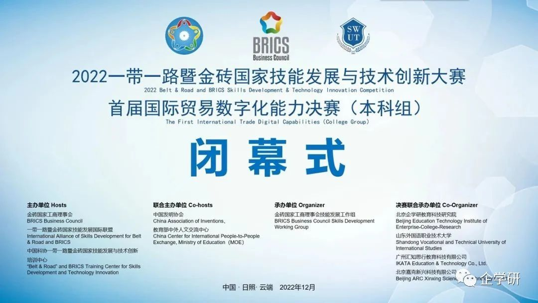 近日,由金砖国家工商理事会、一带一路暨金砖国家技能发展国际联盟、中国科协一带一路暨金砖国家技能发展与技术创新培训中心主办,中国发明协会、教育部中外人文交流中心联合主办,金砖国家工商理事会技能发展工作组承办的“2022一带一路暨金砖国家技能发展与技术创新大赛之国际贸易数字化能力赛项”和“2022一带一路暨金砖国家技能发展与技术创新大赛之跨境电子商务技能及数据分析赛项”两项赛事经过初赛、复赛和决赛的激烈角逐,已经顺利闭幕。