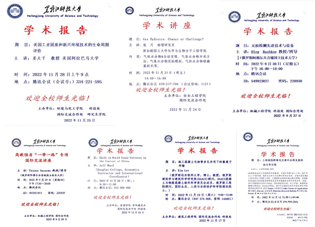 各学院教师克服疫情带来实际困难,积极主动,找准角度,利用线上交流有利条件,开展国际学术交流活动。2022年主办国际学术会议1次(环境与化工学院);参加国际学术会议6次(材料科学与工程学院1次,电气与控制工程学院2次,电子与信息工程学院2次,计算机与信息工程学院1次)。开展国际学术讲座7次(安全工程学院1次,管理学院1次,机械工程学院2次,环境与化工学院1次,理学院1次,建筑工程学院1次);开展中外学生毕业设计展2次(建筑工程学院1次,计算机与信息工程学院1次),是历年国际交流活动数量之最。