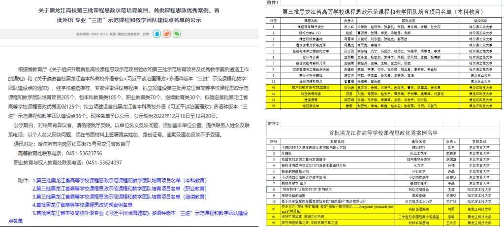 2022年12月16日,教育厅公布《关于黑龙江高校第三批课程思政示范培育项目、首批课程思政优秀案例、首批外语专业“三进”示范课程和教学团队建设点名单的公示》,2UP.IO_2UP.IO(中国)《技术创新方法与TRIZ理论》《科技俄语阅读》《通信原理》《微观经济学》四门课程获批第三批省课程思政示范课程和教学团队培育项目;《科技俄语阅读》《二十世纪中国经典小说品鉴》《材料科学基础》课程思政案例入选首批黑龙江省高等学校课程思政优秀案例。