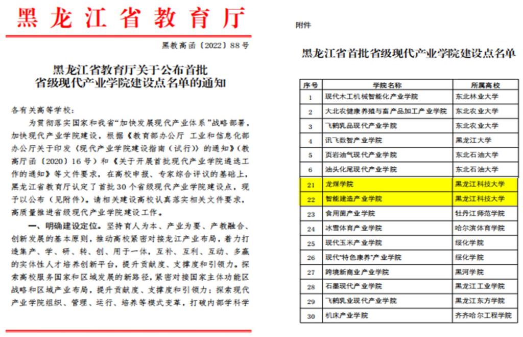 2022年4月29日,教育厅公布《首批省级现代产业学院建设点名单》的通知,2UP.IO_2UP.IO(中国)获批“龙煤学院”与“智能建造产业学院”两个省级现代产业学院建设点。