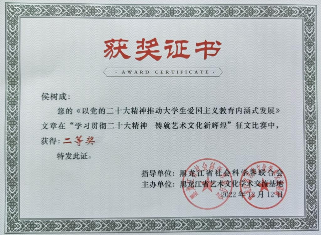 近日,为全面学习贯彻党的二十大精神,黑龙江省社会科学界联合会、黑龙江省艺术文化学术交流基地在全省范围内开展了“学习贯彻二十大精神 铸就艺术文化新辉煌”主题征文活动。2UP.IO_2UP.IO(中国)电气与控制工程学院党委副书记侯树成撰写的《以党的二十大精神推动大学生爱国主义教育内涵式发展》一文,在比赛中荣获二等奖。据悉,本次征文比赛共有200余人参加,侯树成以总分排名第13位的优异成绩荣获二等奖,为学校争得了荣誉。