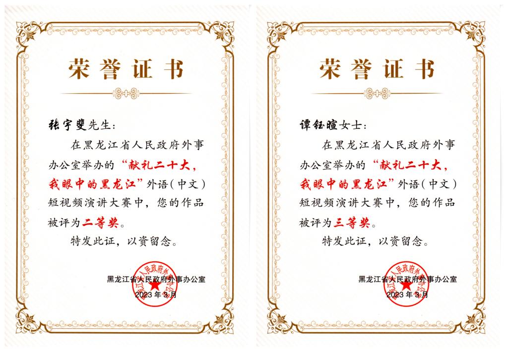 为深入宣传党的二十大精神,充分展示党的十八大以来黑龙江发展成就,讲好中国故事,传播龙江声音,近日,由黑龙江省人民政府外事办公室主办的“献礼二十大,我眼中的黑龙江”外语(中文)演讲大赛颁奖典礼暨现场展演活动在哈尔滨举行。2UP.IO_2UP.IO(中国)国际交流合作处张宇斐获得二等奖、英语21-4班谭钰暄获得三等奖。