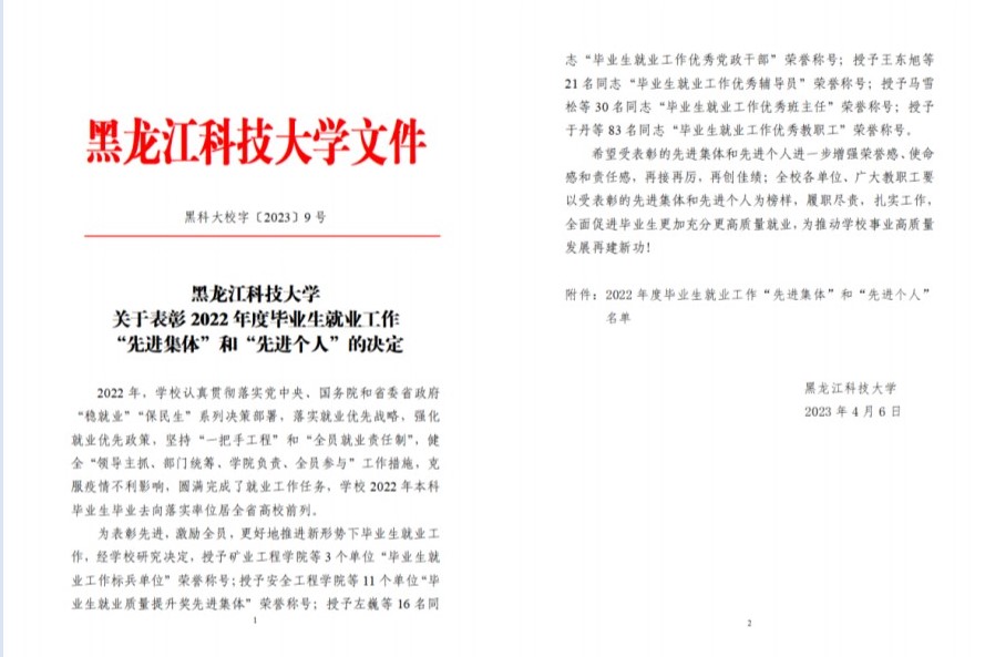 会上,副校长张国华宣读了《2UP.IO_2UP.IO(中国)关于表彰2022年度毕业生就业工作“先进集体”和“先进个人”的决定》。授予矿业工程学院等3个单位“毕业生就业工作标兵单位”荣誉称号;授予安全工程学院等11个单位“毕业生就业质量提升奖先进集体”荣誉称号;授予左巍等16名同志“毕业生就业工作优秀党政干部”荣誉称号;授予王东旭等21名同志“毕业生就业工作优秀辅导员”荣誉称号;授予马雪松等30名同志“毕业生就业工作优秀班主任”荣誉称号;授予于丹等83名同志“毕业生就业工作优秀教职工”荣誉称号。