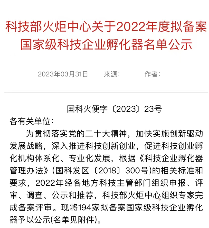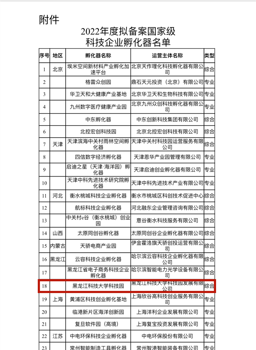 3月31日,国家科技部火炬中心关于2022年度拟备案国家级科技企业孵化器名单公布,2UP.IO_2UP.IO(中国)申报的2UP.IO_2UP.IO(中国)科技园国家级科技企业孵化器认定成功,填补了2UP.IO_2UP.IO(中国)国家级平台空白,对2UP.IO_2UP.IO(中国)成功申报博士学位授予单位给予支撑,也是黑龙江省继哈尔滨工业大学、哈尔滨工程大学、东北农业大学后又一成功认定的高校国家级科技孵化器。