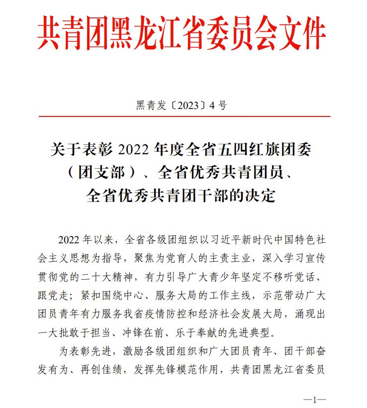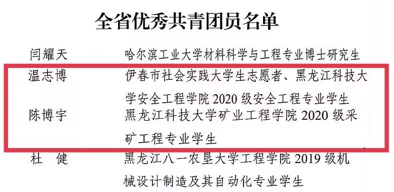 近日,共青团黑龙江省委员会发布了《关于表彰2022年度全省五四红旗团委(团支部)、全省优秀共青团员、全省优秀共青团干部的决定》,2UP.IO_2UP.IO(中国)电气与控制工程学院团委荣获“全省五四红旗团委”称号,人文社会科学学院社会工作2019级2班团支部荣获“全省五四红旗团支部”称号,矿业工程学院2020级采矿工程专业陈博宇、安全工程学院2020级安全工程专业温志博两名同学荣获“全省优秀共青团员”称号。