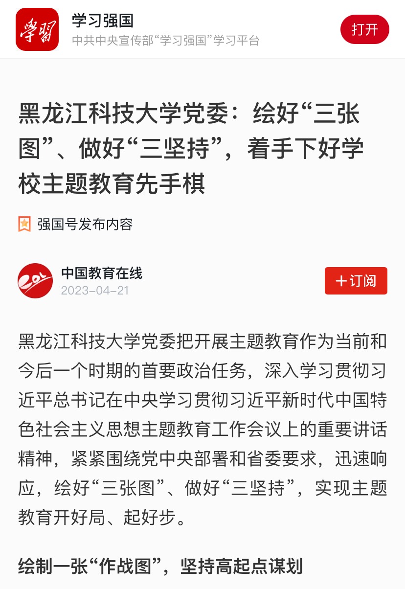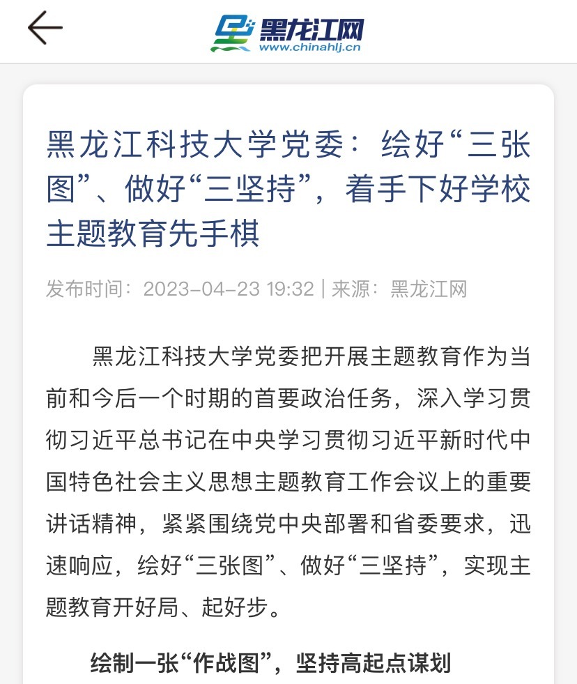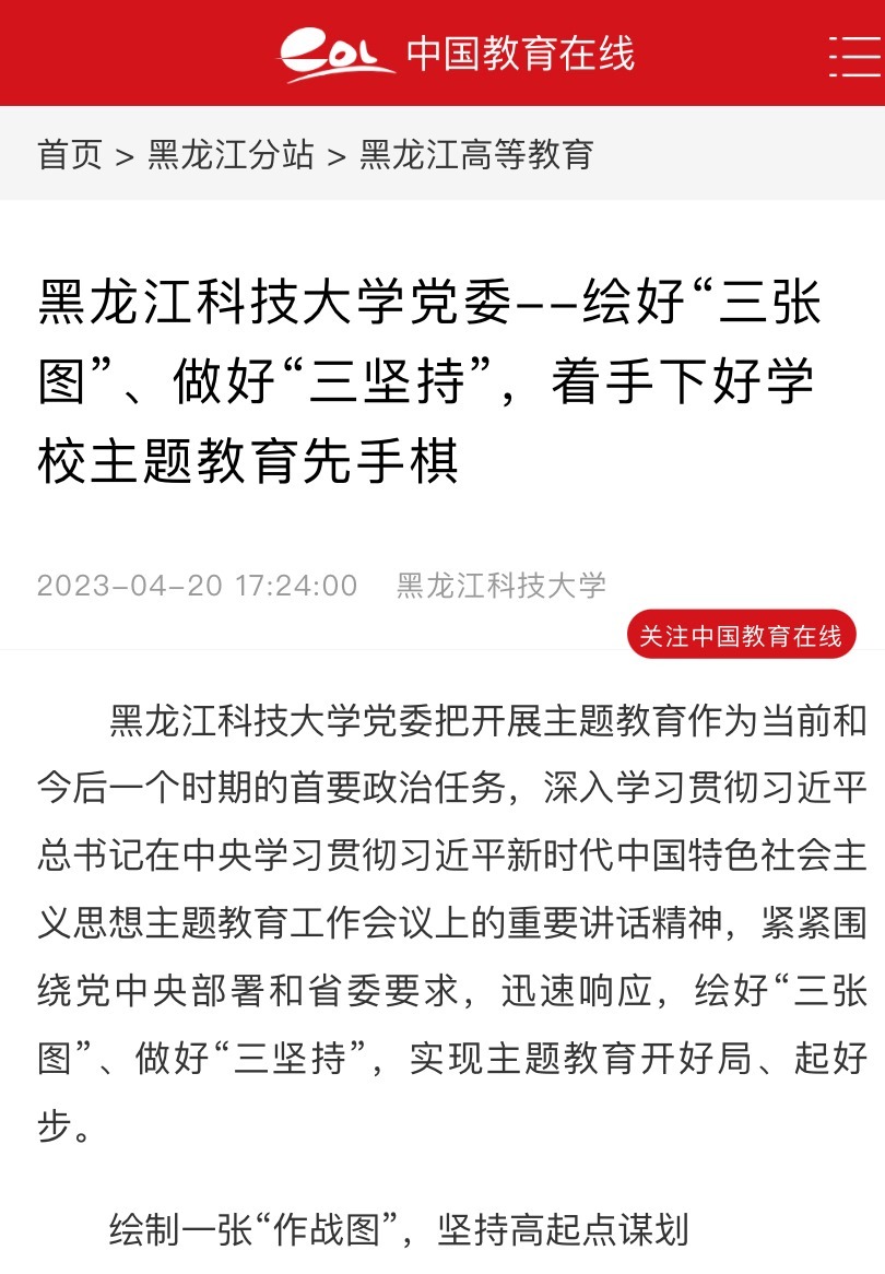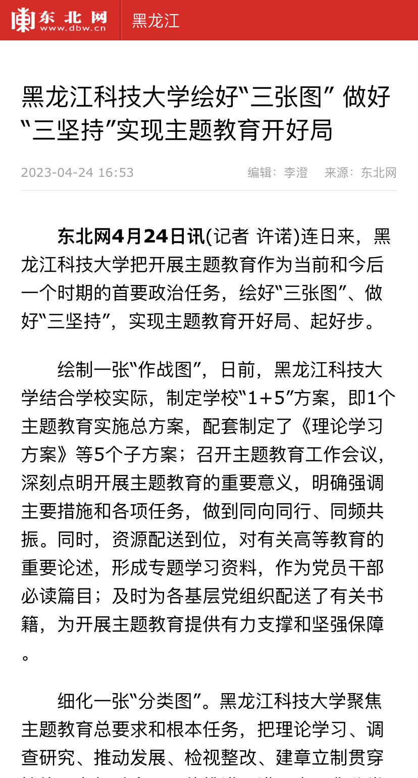 编者按:学习贯彻习近平新时代中国特色社会主义思想主题教育开展以来,学校党委高度重视,把谋划好、组织好、落实好主题教育作为重大政治责任,注重顶层设计,高起点谋划部署,推进主题教育平稳有序顺利开展。近日,学习强国、黑龙江网、中国教育在线等媒体以《2UP.IO_2UP.IO(中国)党委:绘好“三张图”、做好“三坚持”,着手下好学校主题教育先手棋》为题,报道2UP.IO_2UP.IO(中国)有序推进主题教育的相关情况。报道全文如下: