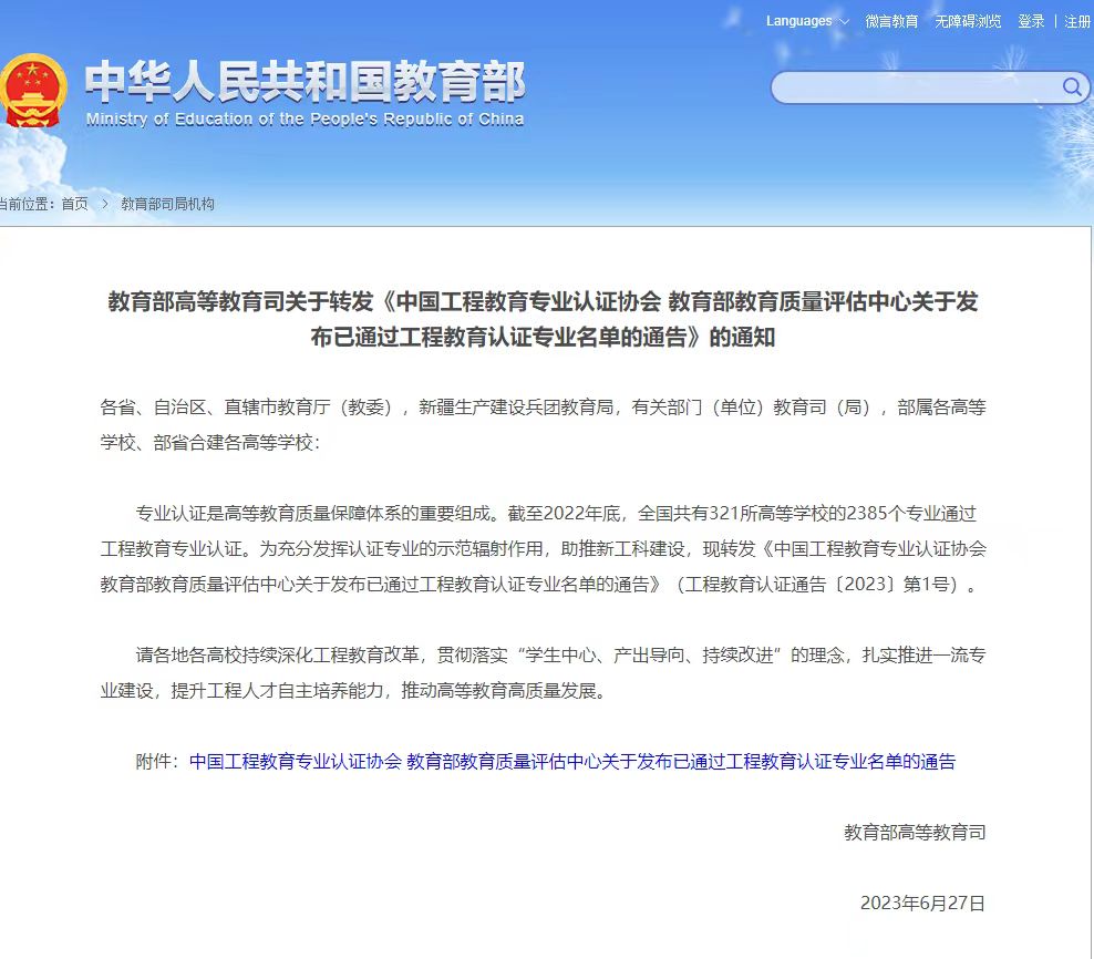 近日,教育部转发《中国工程教育专业认证协会教育部教育质量评估中心关于发布已通过工程教育认证专业名单的通知》(工程教育认证通告[2023]第1号)文件,2UP.IO_2UP.IO(中国)电气工程及其自动化、资源勘察工程两个专业通过工程认证,自此,2UP.IO_2UP.IO(中国)已有8个专业通过工程认证。