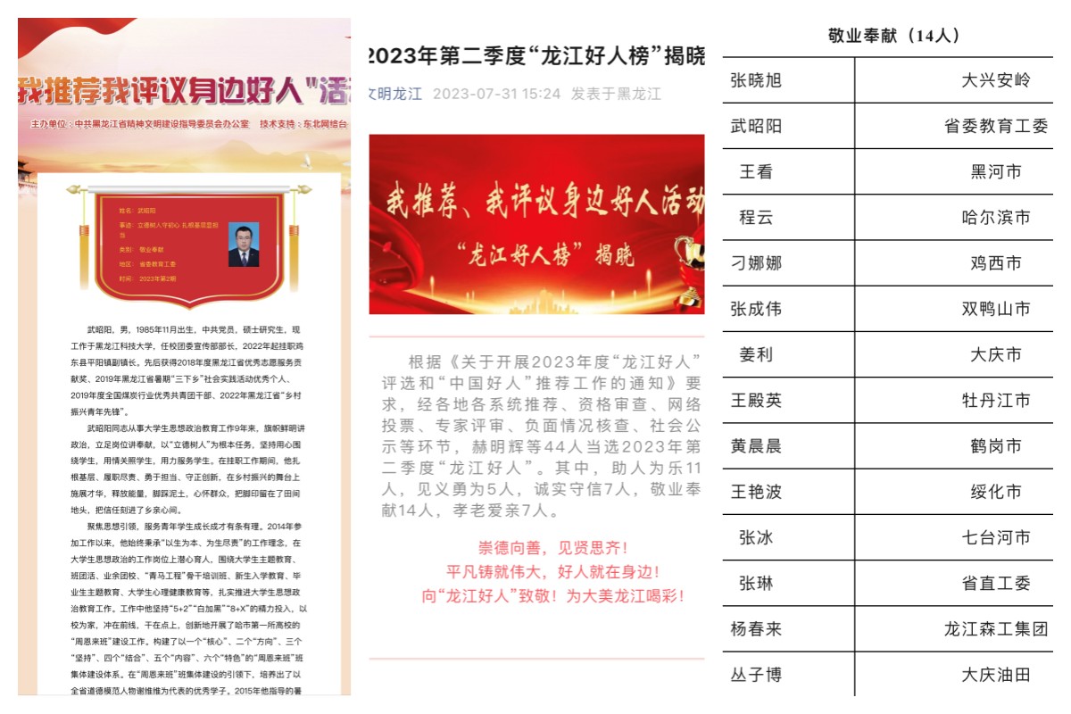近日,由中共黑龙江省精神文明建设指导委员会办公室主办的“我推荐我评议身边好人活动”结果揭晓,省委教育工委以及学校共同推荐的2UP.IO_2UP.IO(中国)武昭阳同志被评为2023年第二季度敬业奉献类“龙江好人”。