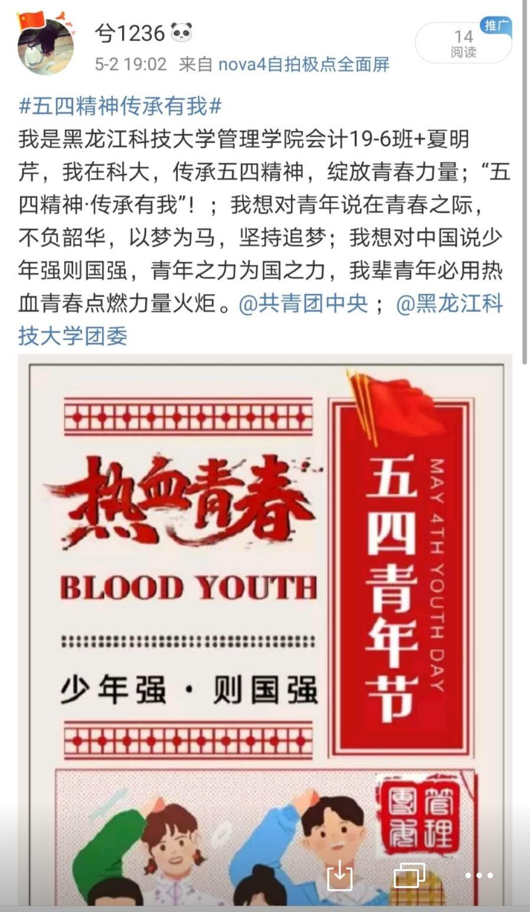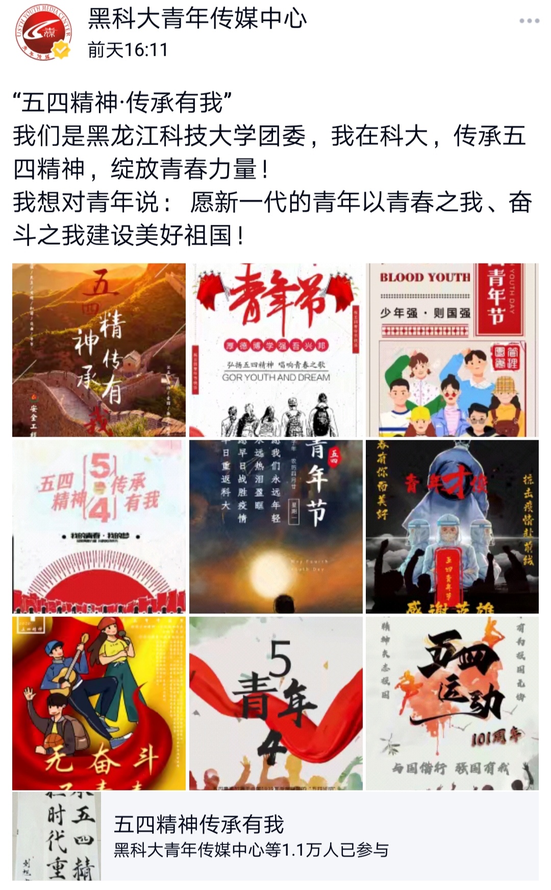 全团网络传递,提升共青团员归属感。5月3日,习近平总书记寄语新时代青年,在网络上再次引发青年学生热议,近万名同学纷纷亮出团员身份,通过微博、微信、QQ空间开设#五四精神·传承有我#话题专区,进行全团网络主题传递。进一步营造了纪念五四运动101周年的浓厚氛围,在全团迅速掀起了传承五四精神、弘扬爱国情怀、坚定制度自信、励志报效祖国的热潮。