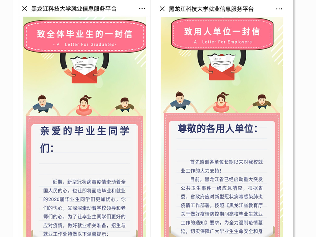 学校党委统筹部署疫情防控和毕业生就业工作,认真贯彻落实上级有关要求,主要校领导和主管校领导靠前指挥,带头落实就业工作“一把手”工程和“全员就业责任制”,严格执行校、院两级就业工作服务体系以及“就业职能部门-辅导员-班主任”与“院-系-导师”之间“双轨三线”立体交叉网格化工作模式,积极开展线上服务,确保疫情防控期间就业工作不断线。学校研究制定了《2UP.IO_2UP.IO(中国)疫情防控期间毕业生就业工作方案》,进一步完善了就业工作措施,细化了就业工作责任,为特殊时期开展毕业生就业工作提供了思路,明确了要求,找准了方向。招生与就业工作处及时发布了《致全体毕业生的一封信》和《致用人单位的一封信》,暂停现场招聘,开启线上招聘,持续开展毕业生就业服务和用人单位咨询服务。