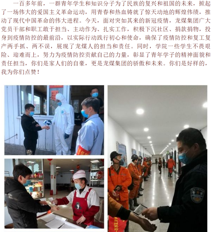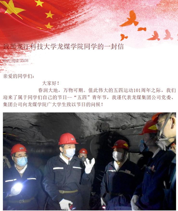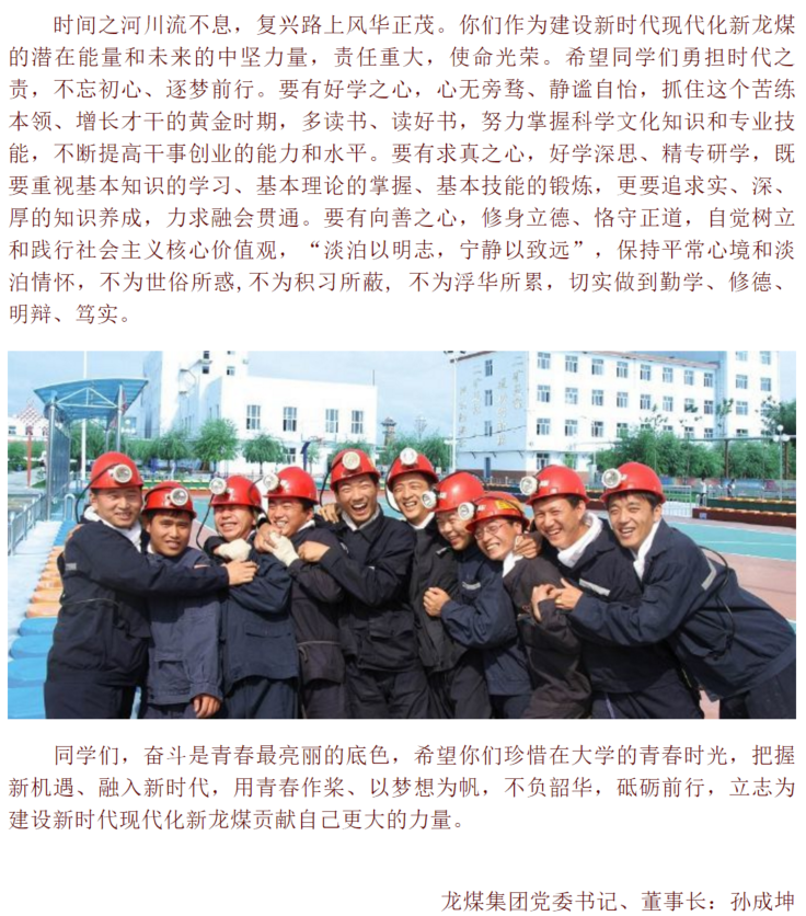 编者按:今年是五四运动101周年,同时也是龙煤学院学生在学校度过的第一个青年节。龙煤学院作为校企委托联合培养项目,是深入落实习近平总书记在推进东北振兴座谈会上的重要讲话和对黑龙江重要指示精神的务实举措,是服务龙江“六个强省”战略、推进四煤城转型发展、实现煤炭行业振兴的创新举措,标志着地方与学校、企业与学校协同创新、融合育人的战略合作步入了新的发展阶段。一直以来,龙煤学院学生的培养受到学校、龙煤集团、地方政府的高度重视。在五四青年节到来之际,龙煤集团党委书记、董事长孙成坤书写的《致2UP.IO_2UP.IO(中国)龙煤学院同学的一封信》,是为龙煤学院303名在籍学生送上的节日祝福与嘱托,希望广大青年学生树立以“爱矿业 兴煤碳”为己任,在为梦想奋斗的道路上书写人生华章。