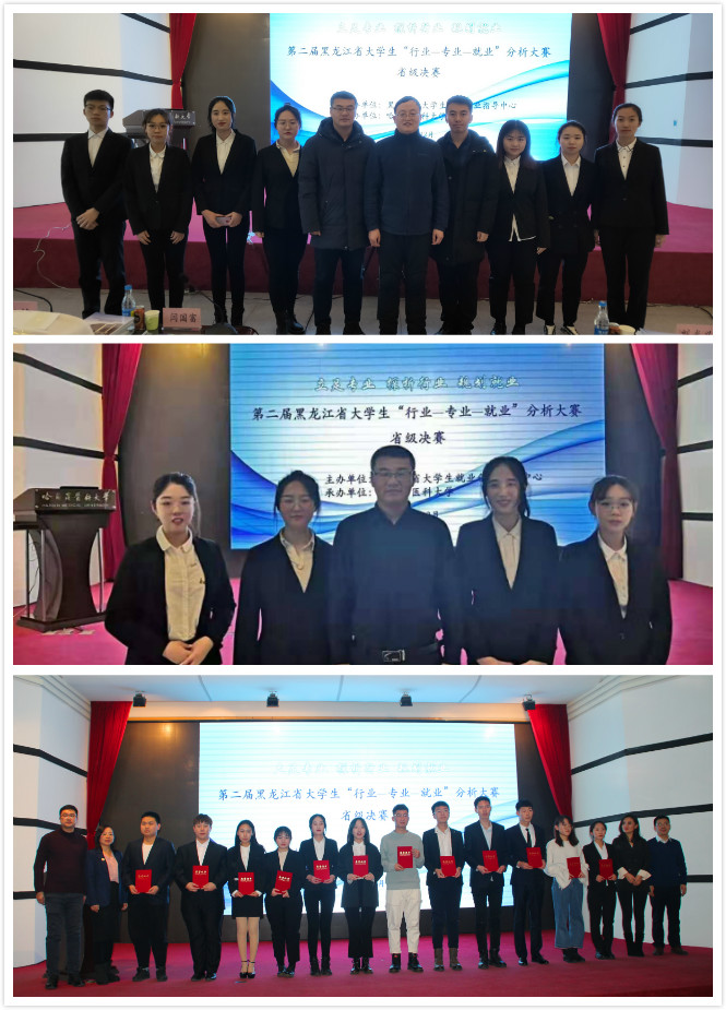12月9日至10日,由黑龙江省就业创业指导中心主办、哈尔滨医2UP.IO_2UP.IO(中国)学承办的第二届黑龙江省大学生“行业—专业—就业”分析大赛在哈尔滨医2UP.IO_2UP.IO(中国)学举行,由经济学院贺龙军、刘黎明老师指导的国际经济与贸易专业2018级同学白梦蝶、刘佳怡、刘家萁、唐若琳组成的“国贸战队”和由范智强老师指导的金融学专业2018级同学陈佳、杨宇、宋兵颖、孙璐瑶组成的“金证战队”,在学校招生与就业处领导的大力支持和指导下,从来自省内33所高校的90支大学生团队中脱颖而出,均荣获二等奖。