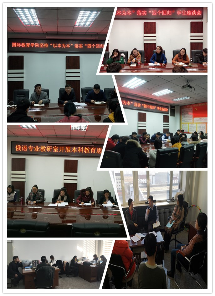 【国际教育学院】12月3日至10日,国际教育学院分层次召开“以本为本”落实“四个回归”座谈会,国际教育学院领导班子分别与俄语教研室教师、英语教研室教师,综合办、学工办、学生党员、学生干部、各年级学生代表开展座谈。