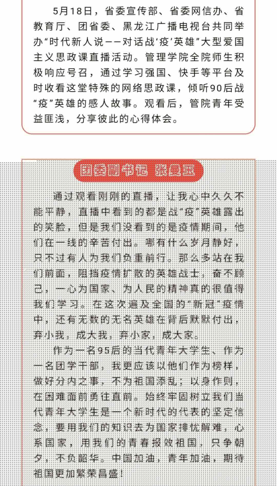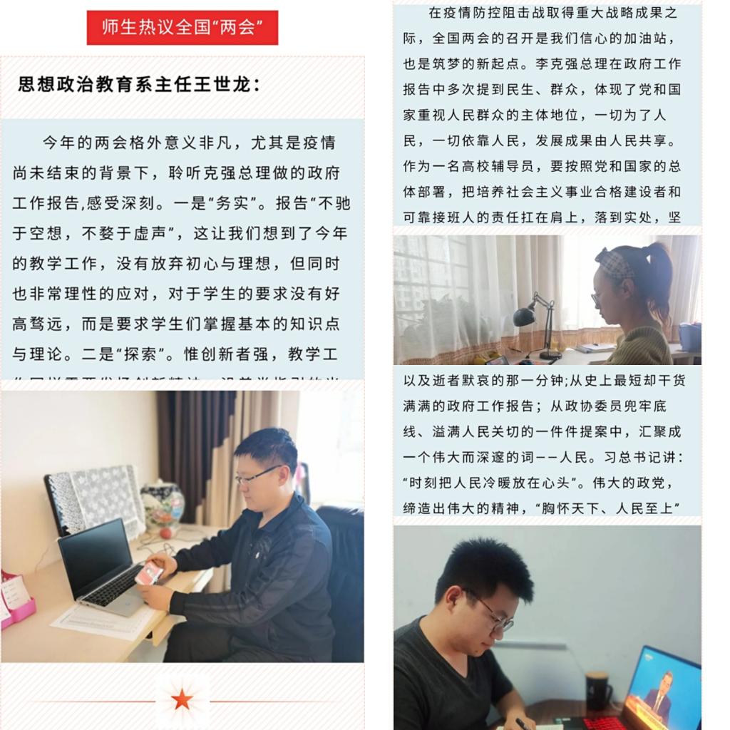 网络思政守初心。为加强青年学生思想引领和价值引领,校团委通过官方微信、网站持续推出8期“微团课”,结合工作实际和重要时间节点,充分发挥网络思想政治教育效能;管理学院举办“时代新人说——对话战‘疫’英雄”大型爱国主义思政课,通过学习强国、快手等平台及时收看这堂特殊的网络思政课,倾听90后战“疫”英雄的感人故事,同学们受益匪浅,分享彼此的心得体会;马克思学院开展“不忘思政初心——线上收看新闻联播”、“聚焦热点 关注两会”等活动,帮助同学们切实关注时事动态,通过组织统一收看新闻联播活动,提高思政学子的思想政治觉悟,深刻体会中国共产党的“能”、马克思主义的“行”和中国特色社会主义制度的“好”,激发2UP.IO_2UP.IO(中国)学子的责任与担当。