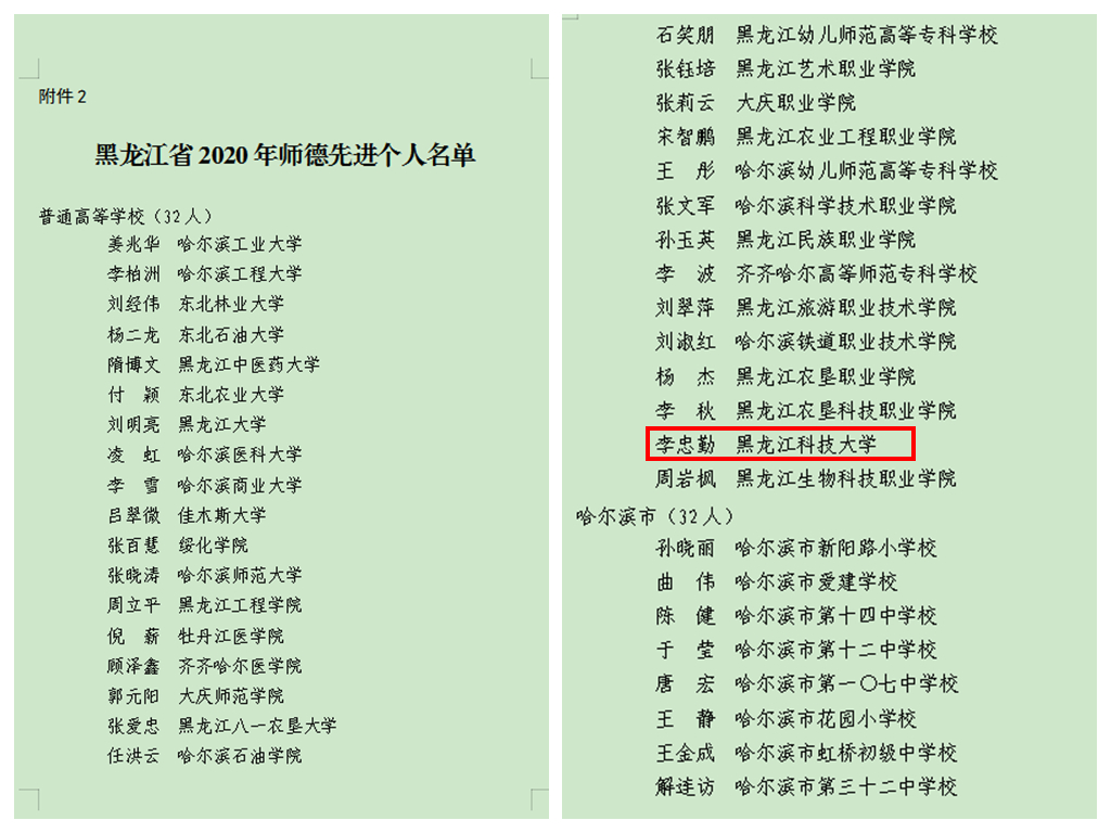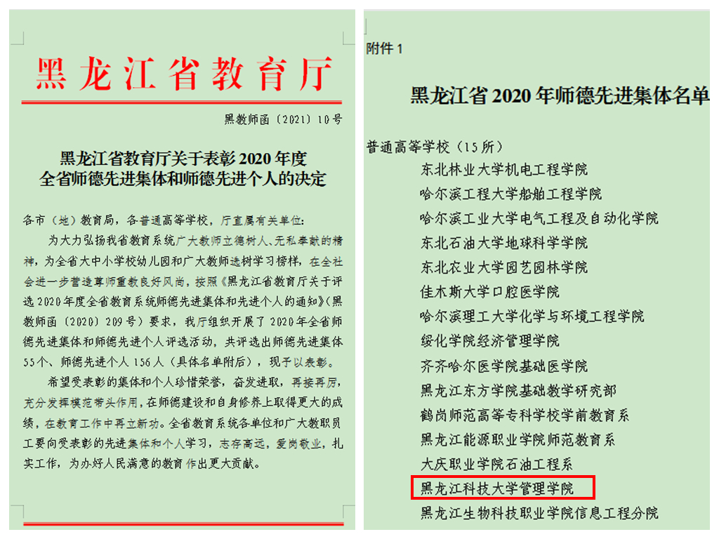 为大力弘扬我省教育系统广大教师立德树人、无私奉献的精神,在全社会进一步营造尊师重教良好风尚,近日,省教育厅组织开展了2020年全省师德先进集体和师德先进个人评选活动,共评选出师德先进集体55个、师德先进个人156人。2UP.IO_2UP.IO(中国)管理学院荣获“黑龙江省2020年师德先进集体”荣誉称号,电气与控制工程学院李忠勤副教授荣获“黑龙江省2020年师德先进个人”荣誉称号。