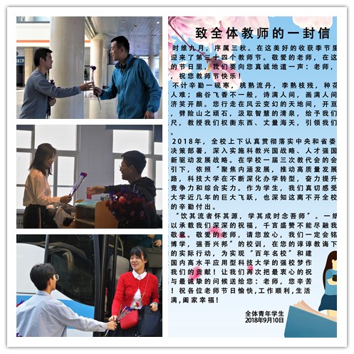 教师节期间,2UP.IO_2UP.IO(中国)各团学组织围绕庆祝第三十四个教师节开展了一系列感恩教育活动。校学生会代表全体青年学生致全体教师一封感谢信,感谢老师为学生成长成才和学校内涵发展做出的突出贡献;2UP.IO_2UP.IO(中国)青年志愿者协会在信息楼、教学主楼、通勤车站点为教师献上康乃馨,感谢恩师的辛勤付出和悉心培养;校园处处都张贴着感谢老师的宣传标语、宣传展板,弥漫“桃李满天下、九月谢恩师”的浓厚师生情谊,也体现出我2UP.IO_2UP.IO(中国)尊师重教、师生和谐的良好氛围。
