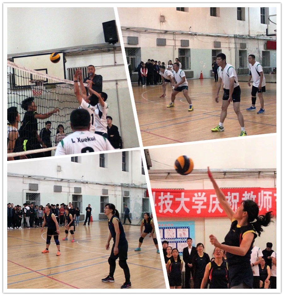 教工排协代表队和大学生排球代表队进行了两场友谊赛,一场进行女教师队对阵女学生队,第二场进行男教师队对阵男学生队,毎场采取三局两胜、每局25分制原则,在全场师生阵阵的掌声和欢呼声中师生双方展开了对战,场上气氛热烈、激动人心,“友谊第一,比赛第二”的和谐氛围在赛场弥漫,呐喊声、助威声奏成了一首美妙的乐章。最终教师队凭借丰富的经验,最终两场比赛均已教师队2:1取得了胜利。