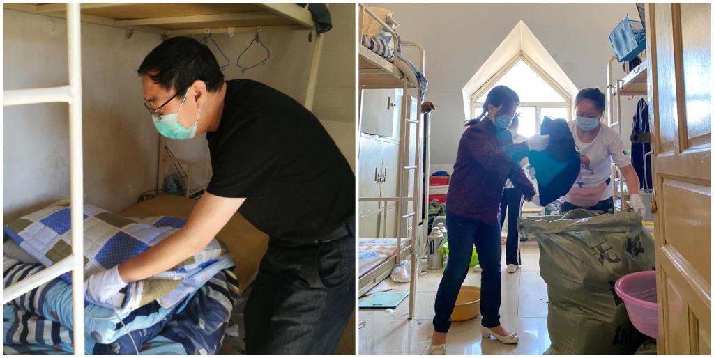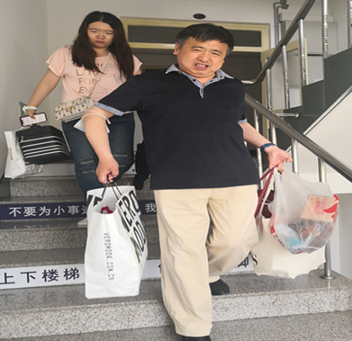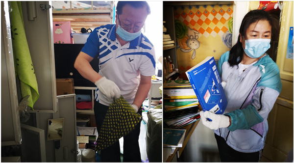 外国语学院党委书记隋大勇、院长徐亚辉为学生打包行李