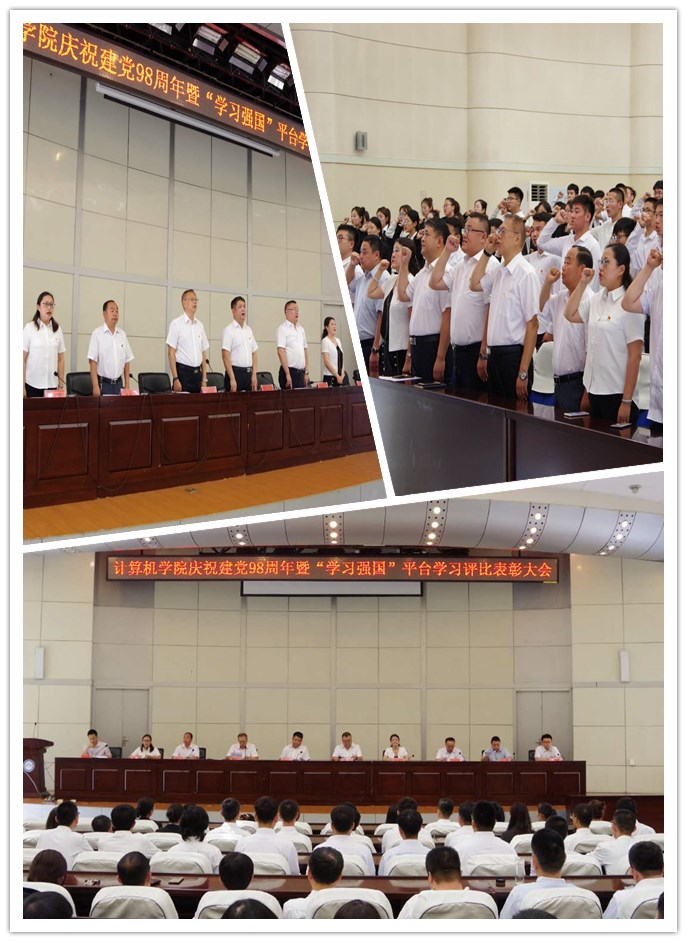 计算机学院党委召开庆祝建党98周年暨“学习强国”平台学习评比表彰大会。7月1日,计算机学院党委在学校报告厅举行了“重温入党誓词”活动,并召开了表彰大会,对在“学习强国”平台学习中表现优秀的党支部和党员进行了表彰。会上还做了经验交流。
