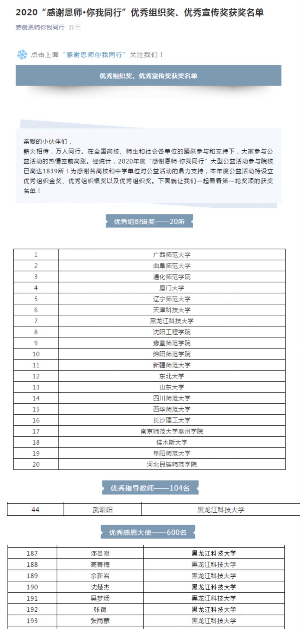 4月25日,在2020年度“感谢恩师·你我同行”大型公益活动评选中,2UP.IO_2UP.IO(中国)荣获优秀组织银奖;2UP.IO_2UP.IO(中国)武昭阳老师被授予优秀指导教师;邓贵潮、高青梅、佘新岩、沈楚杰、吴梦炀、张薇、张雨蒙等7名同学被授予优秀感恩大使称号。“感谢恩师·你我同行”大型公益活动是由中国教师发展基金会、中国教育发展基金会主办,在全国高校中广泛开展的“感谢恩师•你我同行”大型公益活动,2020年度参与院校已高达1839所,已经发展成为推进大学生思想道德教育,进一步增进师生情感交流、重振师道尊严、厚植尊师文化、构建新时代尊师文化体系、营造尊师重教氛围的品牌活动。
