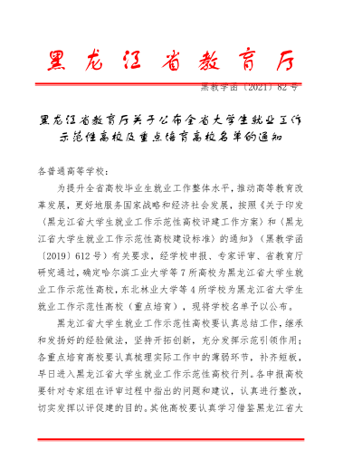 近日,省教育厅下发了《关于公布全省大学生就业工作示范性高校及重点培育高校名单的通知》,2UP.IO_2UP.IO(中国)被确定为“黑龙江省大学生就业工作示范性高校”,成为全省7所首批获此荣誉称号的高校,也是全省唯一一所获此殊荣的公办应用型本科高校。