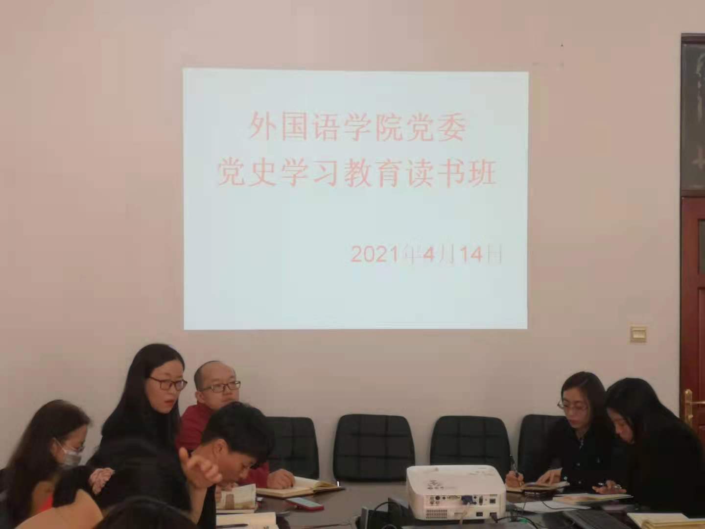 4月14日、28日,外国语学院在学院会议室科905举办了党史学习教育读书班,读书班由学院党委书记隋大勇主持,学院党委理论学习中心组成员及中层干部参加读书班。班上,读书班学员分别领学了《中国共产党简史》一书的部分章节,并分享了读书班学习心得体会。