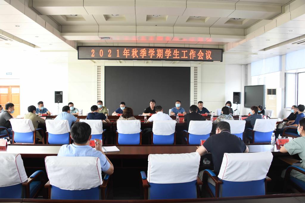 党委副书记于成学在讲话中简要总结回顾了上学期学生工作在春季学生返校、毕业生就业、毕业生文明离校、大学生心理健康、辅导员队伍建设、寝室文化建设、共青团工作等方面所取得的成绩与经验教训。他就全面做好秋季学期学生返校和迎新工作提出四点工作要求:一是醒字当头,认清疫情防控的艰巨性、复杂性、长期性。要把师生生命安全和身体健康放在首位,严格按照上级和属地关于疫情防控工作要求,全力做好秋季学生返校和新生接待工作;要树牢底线思维、保持应急管理状态、落实工作责任,持续织密“防护网”、筑牢“隔离墙”,确保师生的生命安全和身体健康。二是严实结合,把开学启动学生工作的各个环节、各项任务想细落靠。要明确工作任务,坚持思想“绷紧弦”、责任“扛在肩”、行动“拉满弓”,统筹做好今年秋季学期学生返校和新生报到的各阶段、各环节工作,把各项准备工作落实落细落靠。三是履职尽责,注重防范化解学生工作重点领域各种风险与隐患。要坚持问题导向、目标导向,牢牢抓住学生返校、新生入学报到和学生日常教育管理工作的关键时期、关键节点、关键环节,切实加强风险防范,集中解决好学生关切、家长关注的重点难点问题,坚决防范化解学生安全风险隐患,确保学生安全。四是密切配合,在组织协调中保证措施得当。要提高政治站位,加强组织领导,压紧压实责任,全面细化任务举措、做好具体分工,及时抢位补位,确保每个环节不出纰漏、不出问题;要明确岗位职责,履职尽责的落实好2021年秋季学期学生返校工作方案和新生入学接待方案要求,组织好分批错峰开学工作和新生入学报到工作,保障好学生生活质量和学习环境,落实好各单位主体责任。