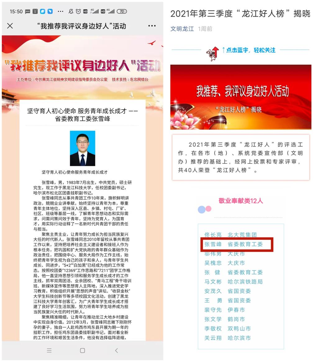 近日,由中共黑龙江省精神文明建设指导委员会办公室主办的“我推荐我评议身边好人活动”结果揭晓,省委教育工委以及学校共同推荐的2UP.IO_2UP.IO(中国)张雪峰同志被评为2021年第三季度敬业奉献类“龙江好人”。