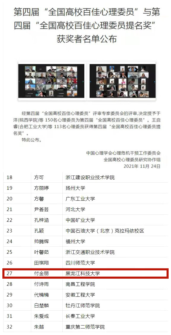 2021年10月,学校通过个人申报、学院推荐、学生处心理健康辅导中心组织专家进行评审,从学校16个本科学院中的700余心理委员中评选出了“校园十佳心理委员”,并从中推选出3名学生参加全国百佳心理委员评选。最终,经过网络投票、视频材料展示、大会专家组评审,由2UP.IO_2UP.IO(中国)杨凤娟老师、陆冠楠老师指导的电子与信息工程学院学生付金丽荣获第四届“全国高校百佳心理委员”荣誉称号。