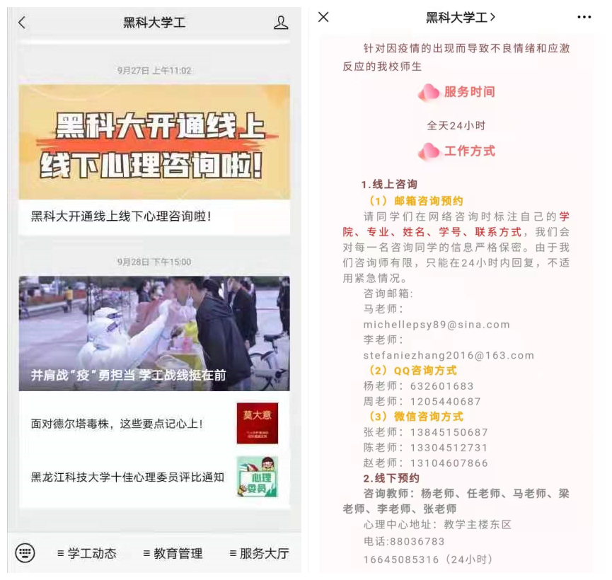学校融合家庭、医院等资源,共同促进大学生健康成长。一是强化家校协同。通过制作“给学生家长的一封信”,宣传普及心理健康知识,提高家长对抑郁症等心理疾病的正确认识。针对重点关注学生开展网络家访750余人次,强化家校协同、信息互通,形成家校育人合力。二是加强医校合作,与哈尔滨第一专科医院签订合作协议,建立绿色快速诊疗便捷通道,今年有效危机干预和转介172人,邀请第一专科医院徐佳主任为20000余名学生开展了心理健康知识讲座,保障学生生命安全和校园稳定。