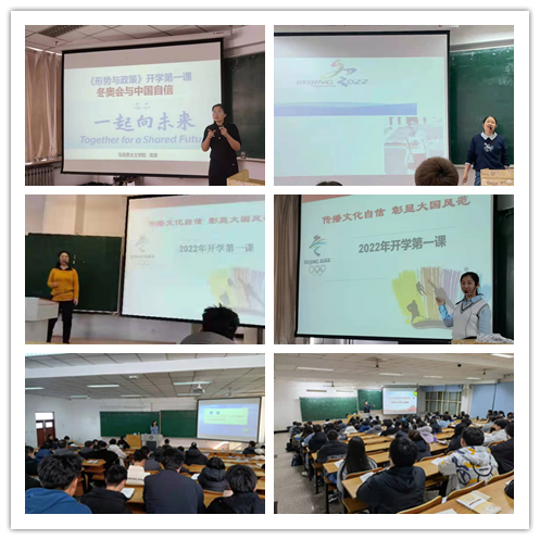 马克思主义学院以“青春正当时,一起向未来”为主题,在全校大学生中积极开好“第一堂思政课”。学院各教研室结合课程内容及特点,将北京冬奥会精神融入到开学第一课内容当中,形势与政策教研室群策群力,由唐凤丽和王娟老师制作了《冬奥会与中国自信》专题课件和讲稿,并进行了集体备课;马克思主义基本原理教研室主任王世龙老师将冬奥知识与新学期大学生该如何发扬冬奥精神相结合做了专题课件;毛泽东思想与中国特色社会主义理论体系概论课以“和平、团结精神”为主线,教育学生传承奥运精神,奋进新时代。习近平新时代中国特色社会主义思想概论教研室主任庄得宝在集体备课中对结合冬奥精神开展“开学第一课”教学进行了专项布置。