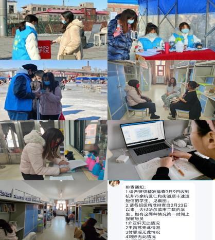 责任在肩,“严”字当头。严格管理,把好“三关”。把好学生返校关,针对不同地区返校学生,学院辅导员、班主任对申请返校学生信息进行严格审核;把好学生入校关,学院志愿者对返校学生核酸结果、返校申请审批、龙江健康码、行程大数据卡进行一一检查;把好学生数据关,严格执行日报告、零报告制度、体温监测制度等,通过班级接龙、钉钉打卡等方式全面收集学生信息,全方位了解学生返校行程、返校后请假出校情况等,做好疫情防控信息排查工作。严格执行文明寝室日验收、夜不归寝零汇报制度,确保安全隐患早排查,夜不归宿零发生,做到及时了解学生实时动态。