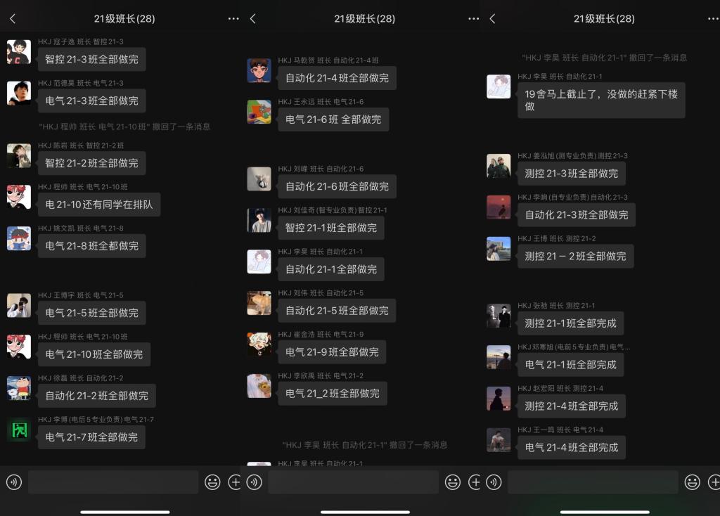 7:03接到学生处通知,今日核酸抽检改为全员核酸检测。看到通知后我第一时间联系学生组织和班级干部,调整核酸检测工作安排。身经百战的志愿者们早已习惯了这种临时的工作安排,能够迅速的做出调整。