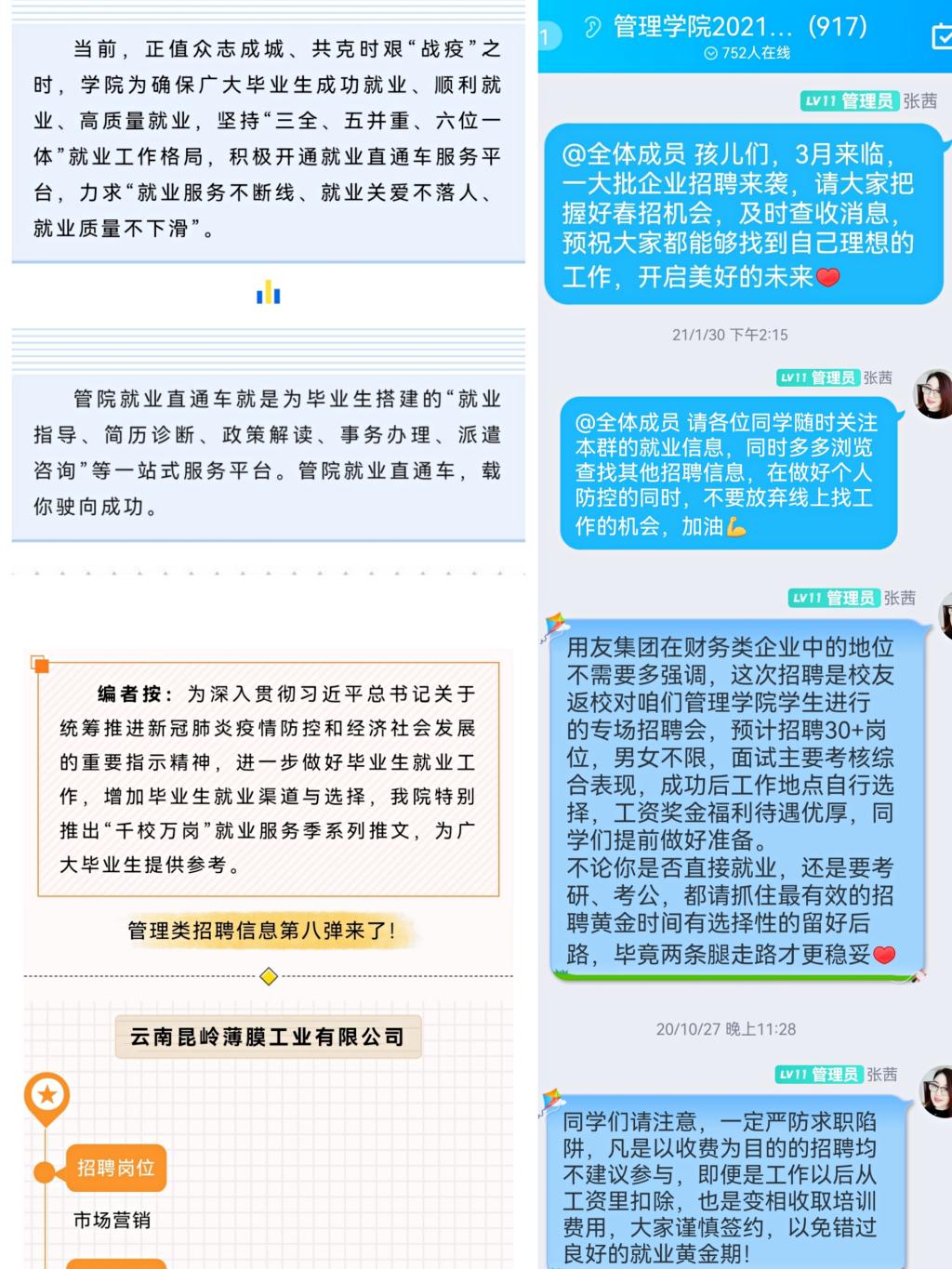 三、坚持把握“传”的联动点,传递信息传递真情,掌真况出实招。毕业班辅导员作为上情下达、下情上传的关键一环,她分别围绕学生考研、公考、求职、创业等方面开展了6次全面系统的就业摸排,累计推送就业信息7000余条,开通了“管院就业直通车”线上平台,及时帮助学生解决就业过程中遇到的各种问题。围绕中铁十五局、中建二局东北分公司、龙建路桥、新道用友等多家与我院长期共建企业的招聘实际,开展了双向专项调查。得益于学院“德知行思”人才培养特色,学生深受用人单位好评,并实现48名毕业生到上述单位成功就职。