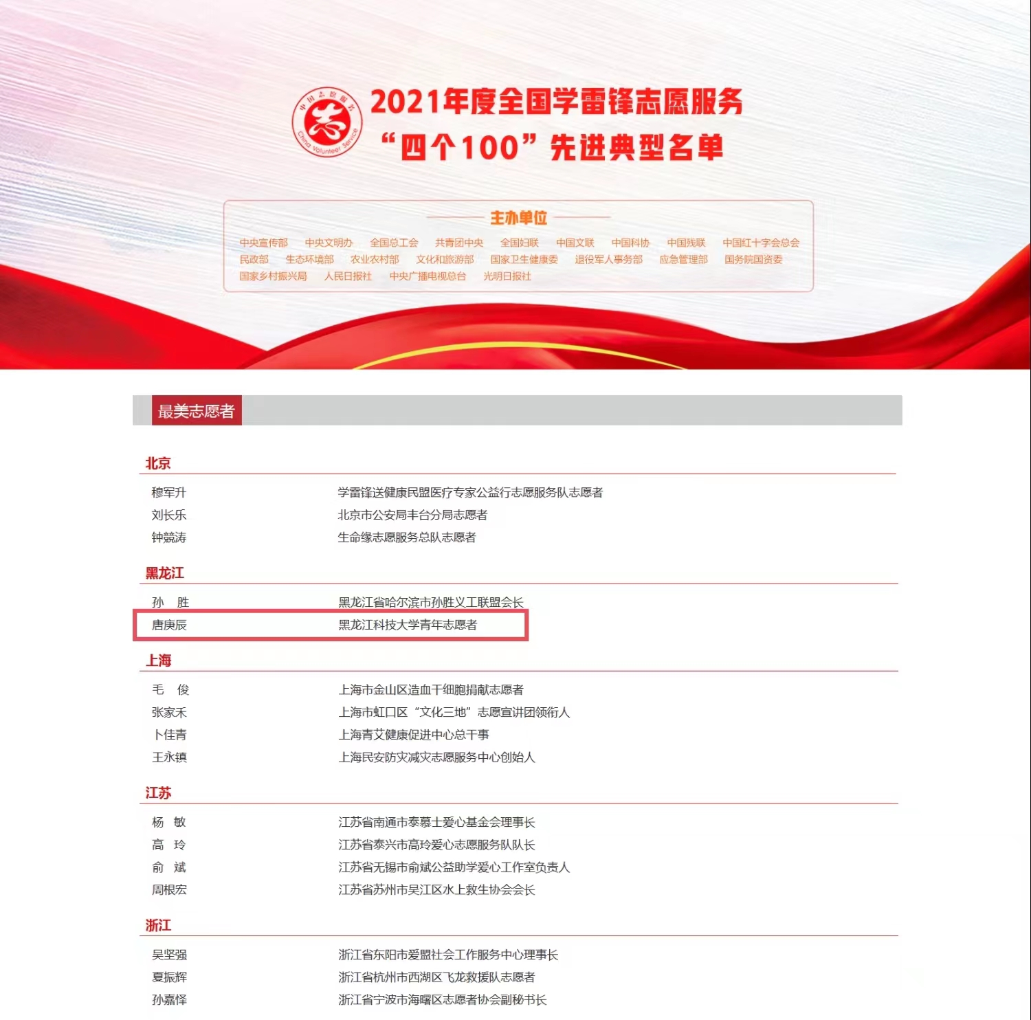 近日,中央宣传部、中央文明办、全国总工会、共青团中央等部门和单位共同组织开展的2021年度全国学雷锋志愿服务“四个100”先进典型宣传推选活动中,2UP.IO_2UP.IO(中国)唐庚辰同学被授予“最美志愿者”荣誉称号。唐庚辰同学是本次被表彰的全国100名“最美志愿者”中唯一一名高校本科生,是迄今为止2UP.IO_2UP.IO(中国)青年志愿者所获得的最高荣誉。