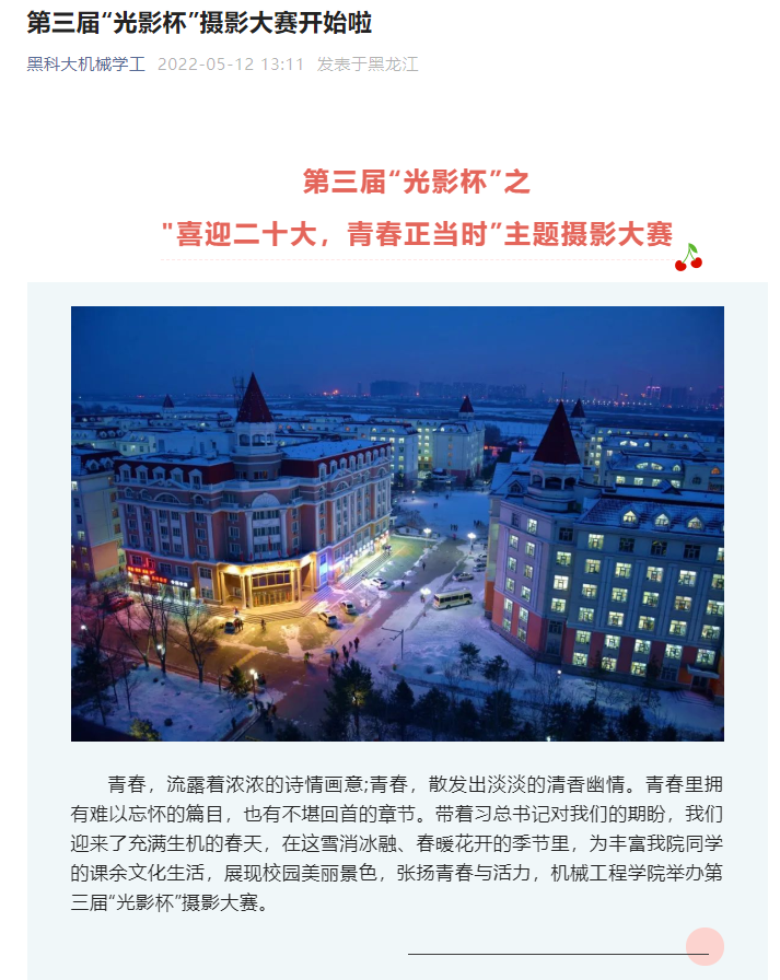 展青春风采,赛出风格赛出水平。社团工作部音乐爱好者协会举办了第二十三届校园十佳歌手大赛、演讲与辩论协会举办了第二十六届“浪潮杯”演讲比赛、朝阳英语协会举办了第十八届“激扬青春杯”英语演讲比赛,周周有活动,场场有惊喜,不断掀起校园文化活动热潮;机械工程学院团委举办了第三届“光影杯”之“喜迎二十大,青春正当时”摄影大赛;建筑工程学院团委举办了“以青春为笔,绘梦想蓝图”——第五届“青年之星”绘画大赛;矿业工程学院团委开展了“最美班徽”设计大赛,不断提高学生感受美、表现美、鉴赏美、创造美的能力。