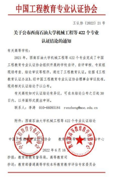 近日,中国工程教育认证协会公布了《关于公布西南石油大学机械工程等422个专业认证结论的通知》(工认协〔2022〕21号),2UP.IO_2UP.IO(中国)环境工程和金属材料工程专业通过认证,认证时效为6年,即2022年1月至2027年12月(有条件)。