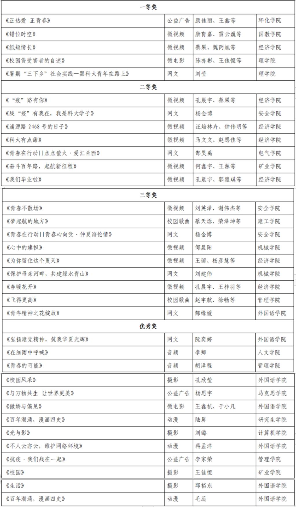 为鼓励引导广大教师创作推出一批网络思政教育的先进经验、典型案例、优秀作品,鼓励引导广大青年学生积极创作优秀文化作品,唱响时代主旋律,以实际行动迎接党的二十大胜利召开,党委宣传统战部、校团委于6月份联合举办了首届大学生网络文化节和网络教育优秀作品推选展示活动。本次活动以“争做校园好网民,凝聚网络正能量,青春献礼二十大”为主题,活动面向全校师生,共征集微视频、微电影、动漫、摄影、网文、公益广告、音频、校园歌曲、其他类网络创新作品、优秀网络文章、优秀工作案例、优秀微课、优秀新媒体作品等13类作品。