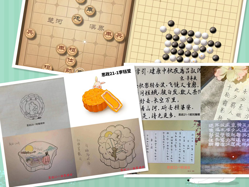 马克思主义学院组织开展“月下寄相思,天涯共此时”迎中秋系列活动。以笔传诗,聚焦传统文化。通过开展名篇佳作誊抄赏析活动,组织青年学生选取佳作手写传抄,怀古品鉴争做传统文化的“宣传员”,还开展了月饼图案设计和棋艺大赛等活动。