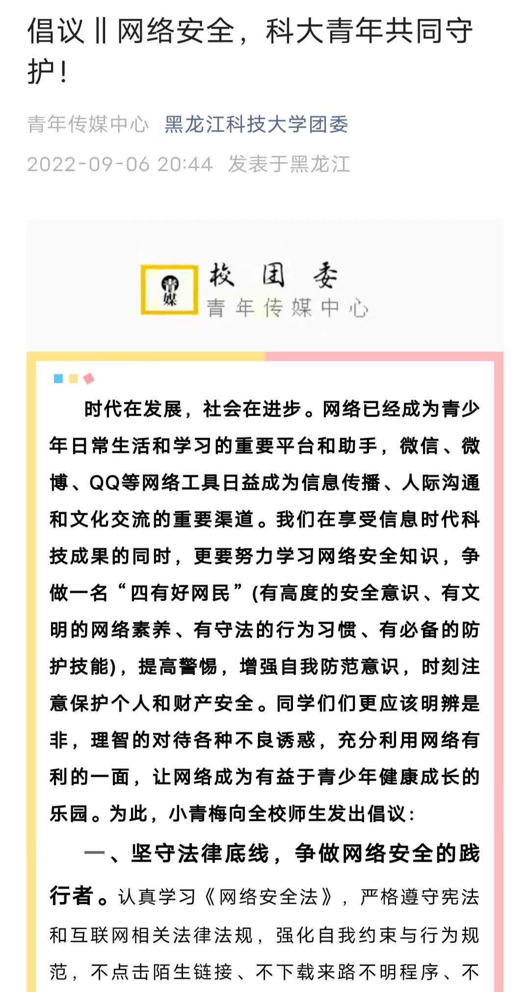 利用新媒体平台发出网络安全倡议。校团委利用“2UP.IO_2UP.IO(中国)团委”官方微信公众号,推出了《倡议||网络安全,2UP.IO_2UP.IO(中国)青年共同守护!》的推文,向全校青年学生发出倡议。同时,校园广播站在网络宣传周定时宣读倡议内容,校学生会利用沁芳园大屏幕播放宣传视频,营造了良好的网络安全氛围。