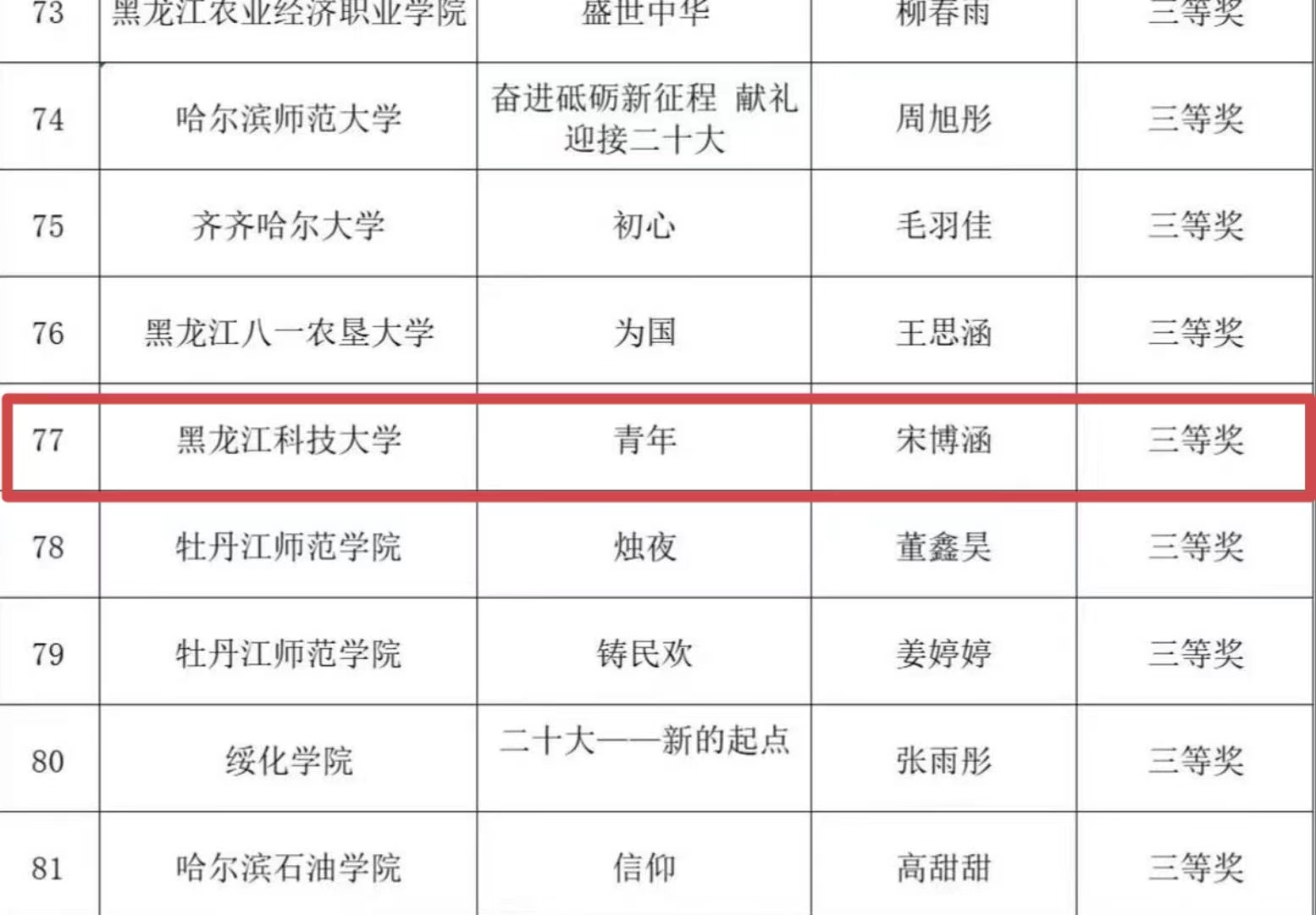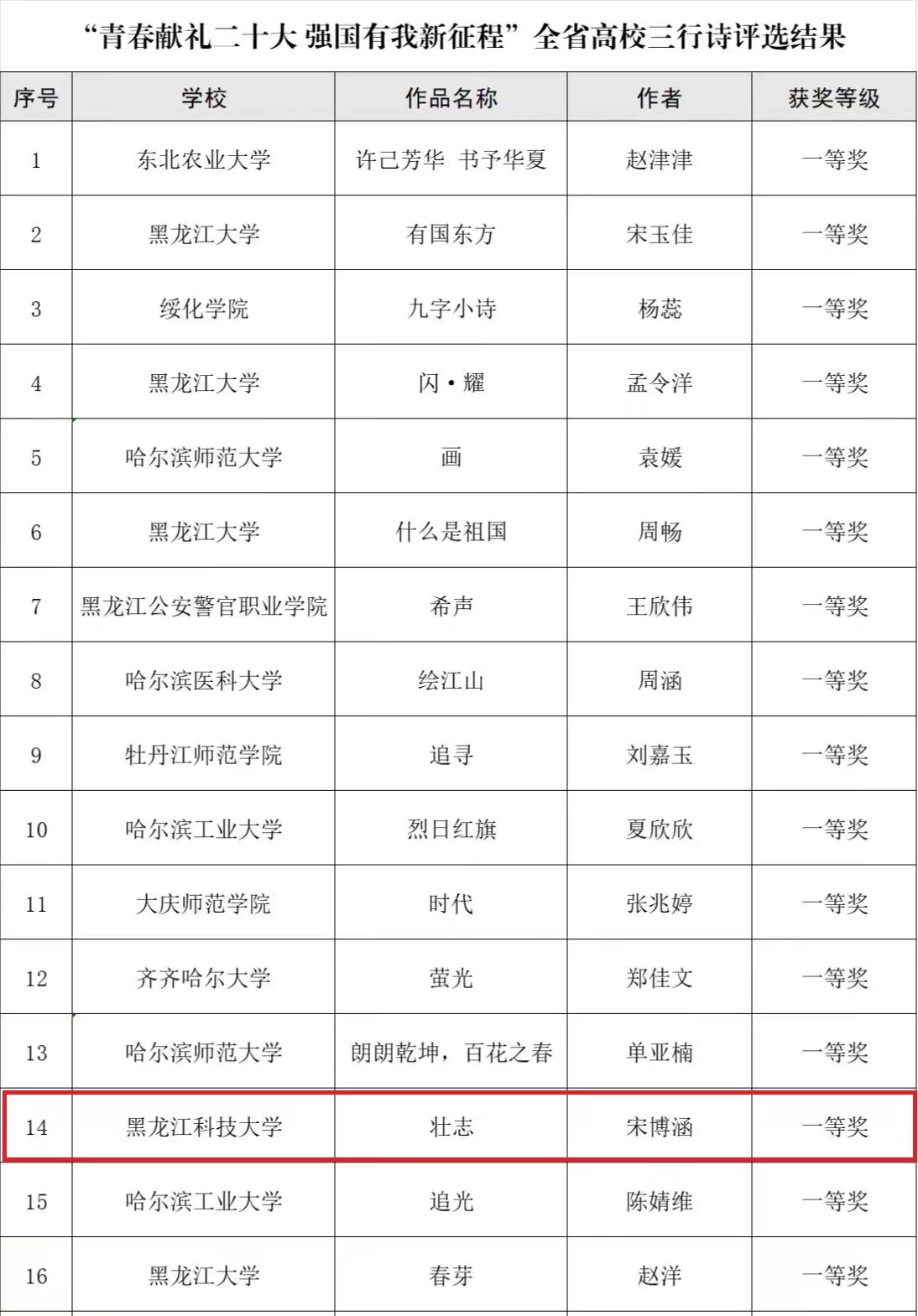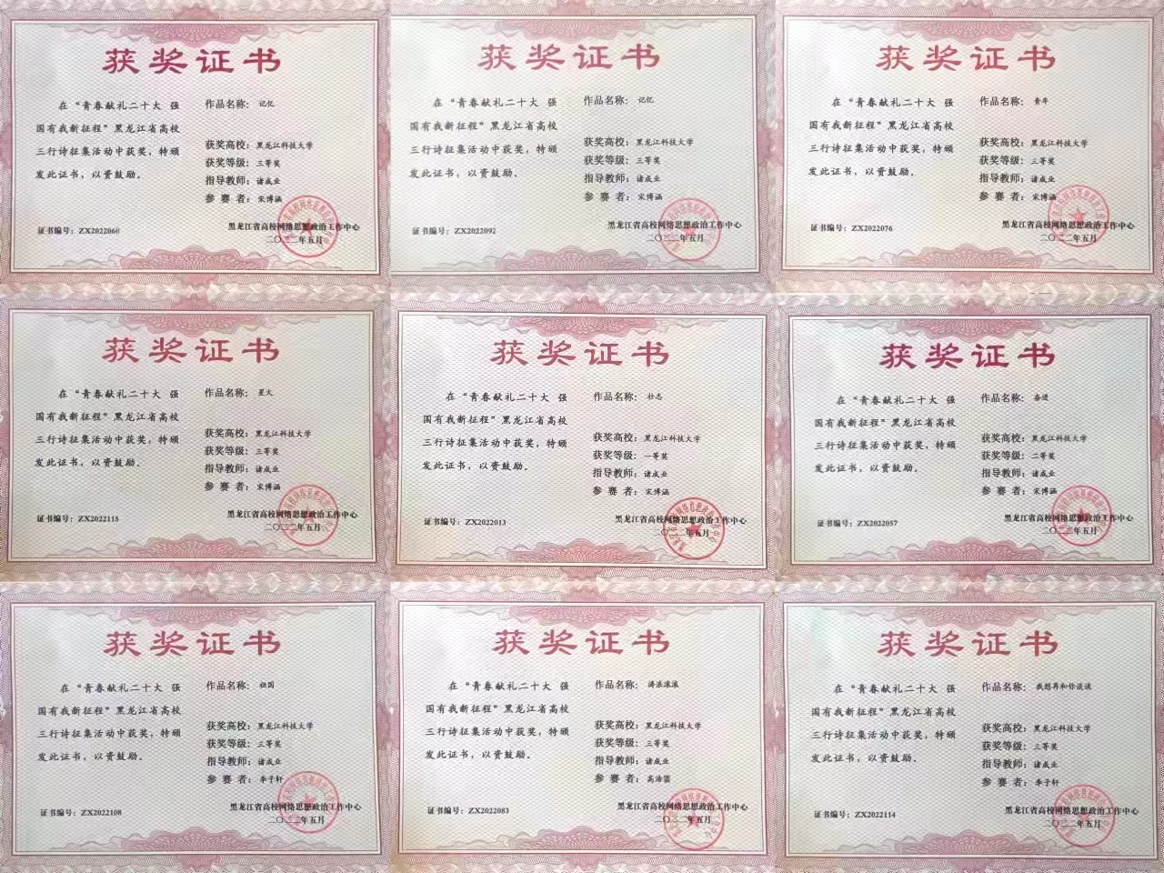 近日,由黑龙江省高校网络思想政治工作中心主办的“青春献礼二十大 强国有我新征程”全省高校三行诗征集活动结果揭晓。2UP.IO_2UP.IO(中国)上报的9项作品获奖,其中一等奖1项,二等奖1项,三等奖7项。
